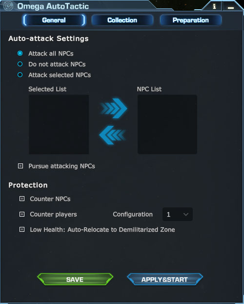 You can also configure if you want to counterattack NPCs and other players when they attack you. Furthermore, you can determine a specific ship configuration to activate when counterattacking another player.